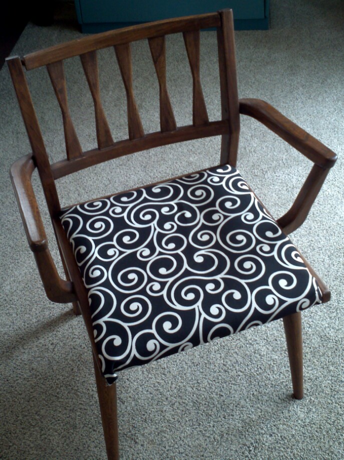 Thanks to those who gave feedback on my The Chair…part 2 post. Well, after going back and forth and back and forth I finally settled on the fabric that got the most “yes”-es from my family… the black and cream swirly fabric.