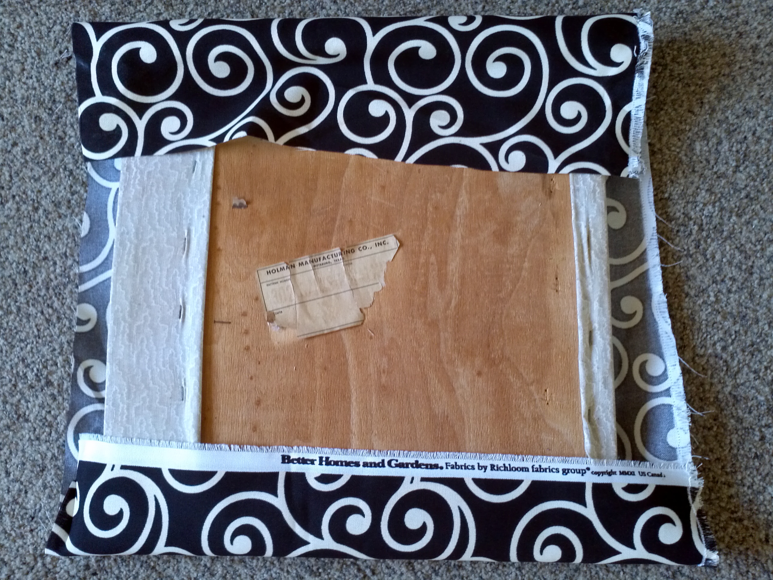 I swear that I have seen people recover chair seats on HGTV a thousand and three times. I have never done it before myself, but found it to be just as easy as it looks. First lay the seat cover wood side up on top of the wrong side of the fabric. Allow enough of a clearance on all sides to easily wrap the fabric around and staple it securely.