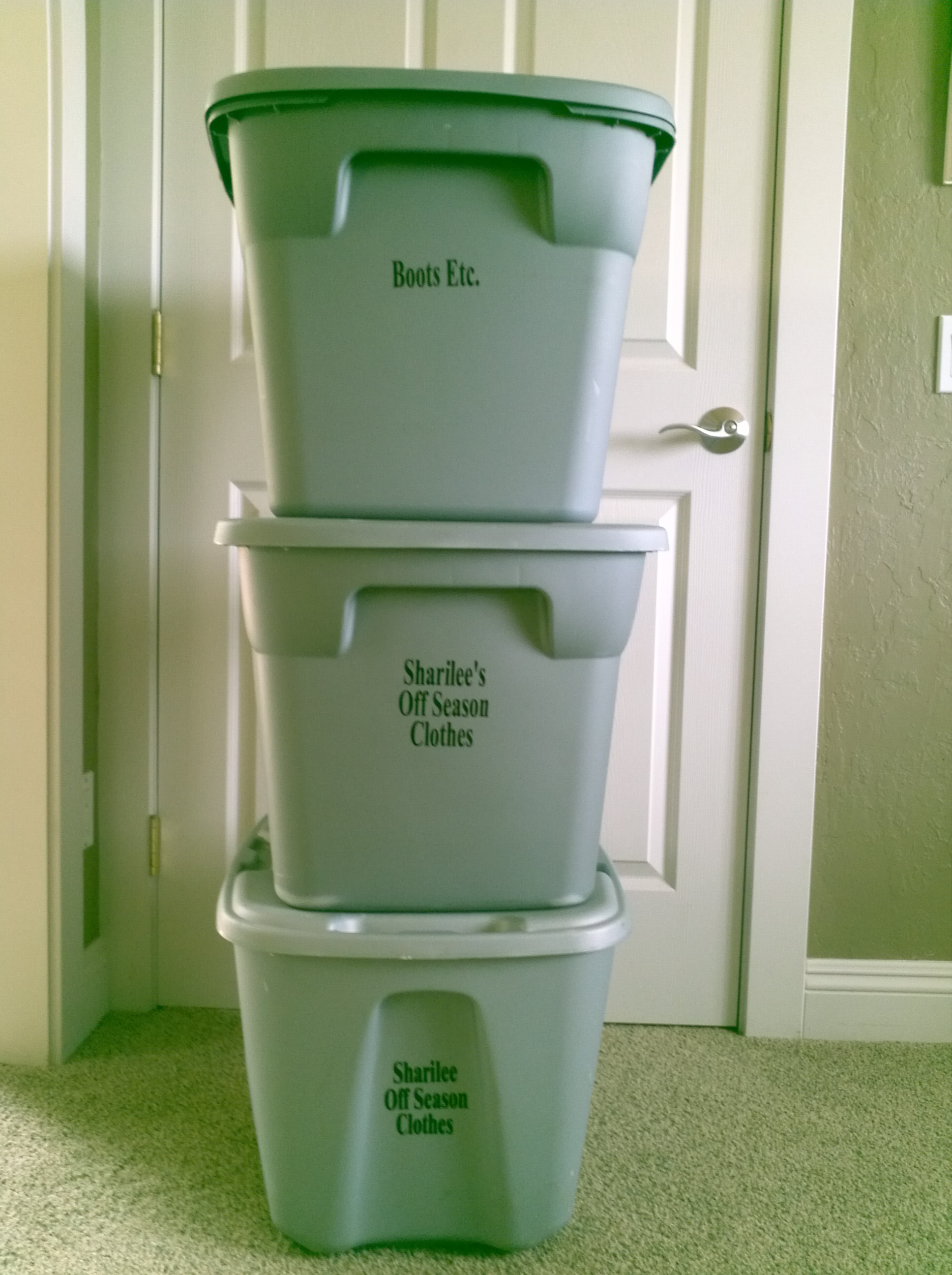 Every spring as it starts to get cold I bring these bins out of the garage and pull out all of the clothes that I had packed away the previous fall. Out come all of my capris, shorts, short-sleeved tops, swimsuits and sandals… you get the idea. Come cooler weather, the same bins come back in for the great fall switcheroo. Out come the coats, jackets and sweatshirts,
