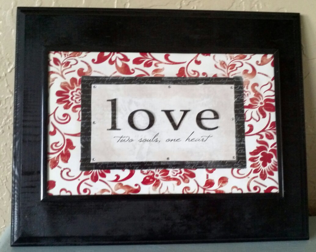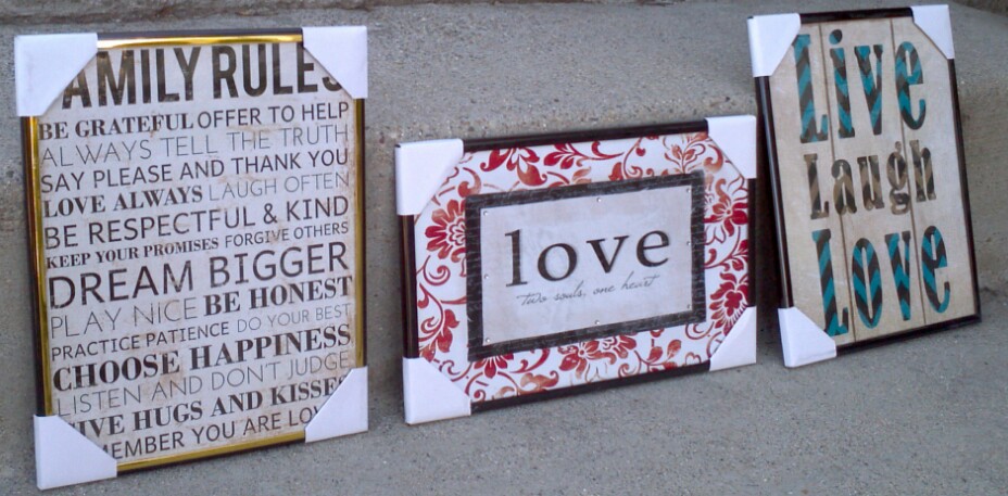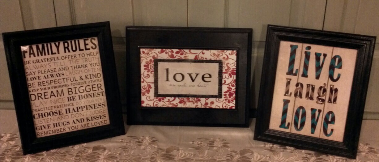I’ll admit that I have bins full of frames, plaques, cut lumber. Most of the frames are yard sale or thrift store finds. Cheap. Once I got home it didn’t take me long to figure out a plan and less than an hour later (I had to wait for the black spray paint to dry), I had 3 new pieces of art: