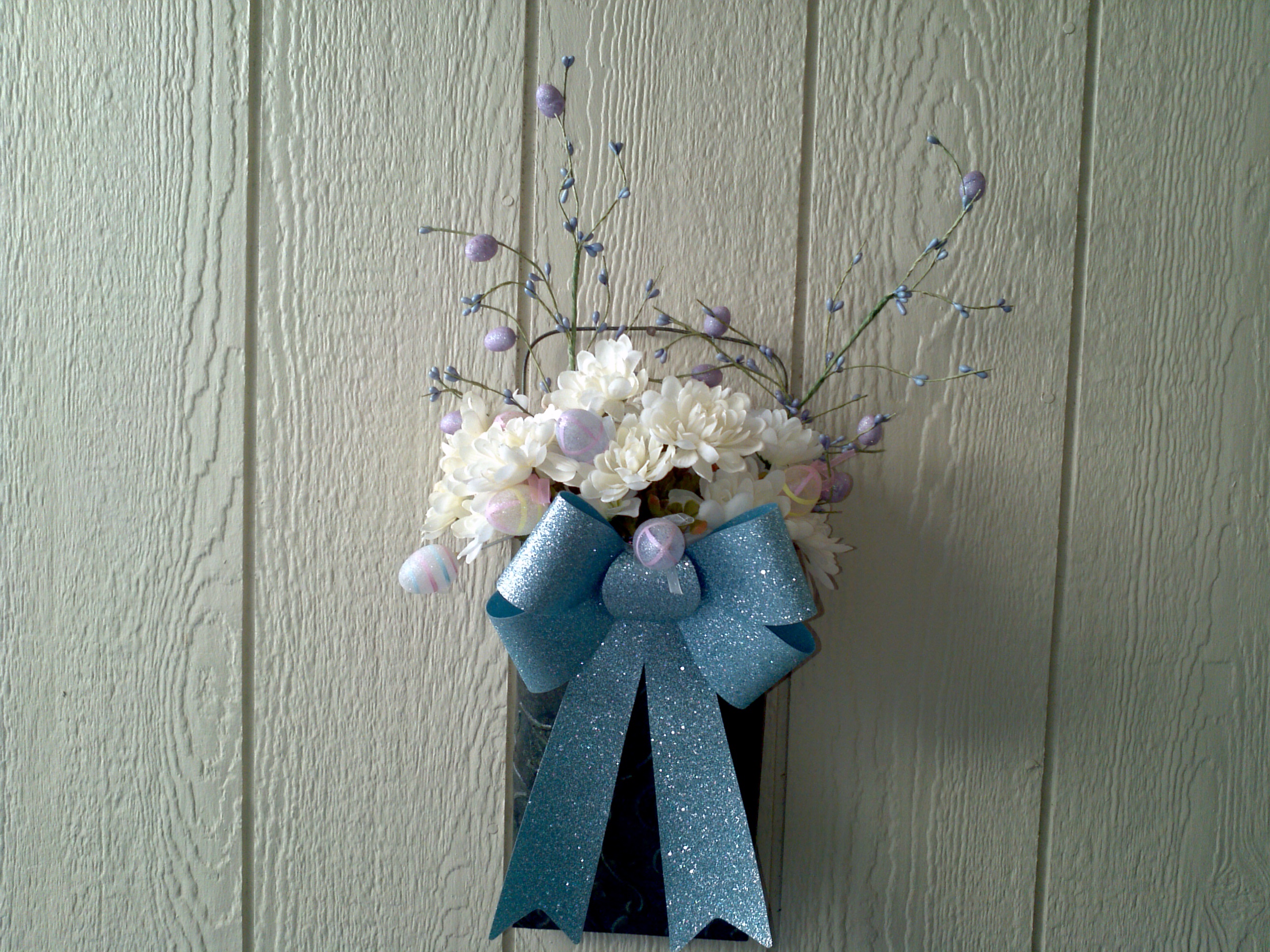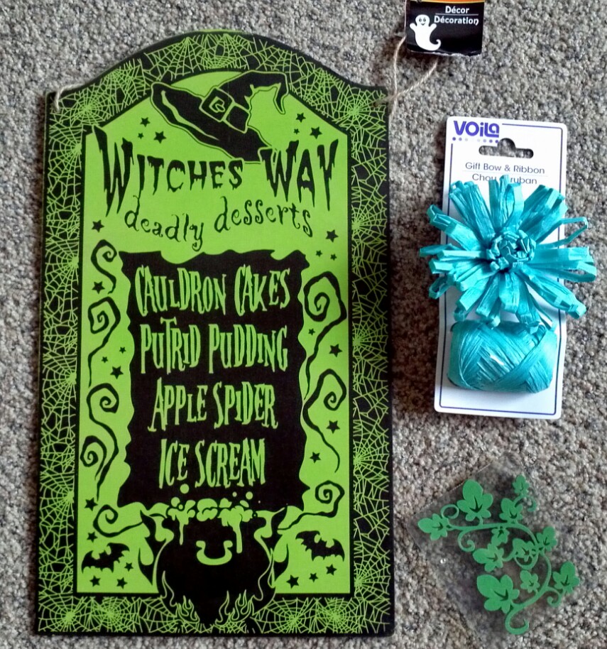 Are you thinking what I’m thinking? As I continued to walk around Dollar Tree I found the turquois bow/ribbon (also pictured) in the giftwrap section. (Oh, just ignore the ivy-looking foam stamp in the bottom corner of the above pic… I decided to nix my idea for that. Maybe another time.) See where I am going with this? No? OK, keep reading.