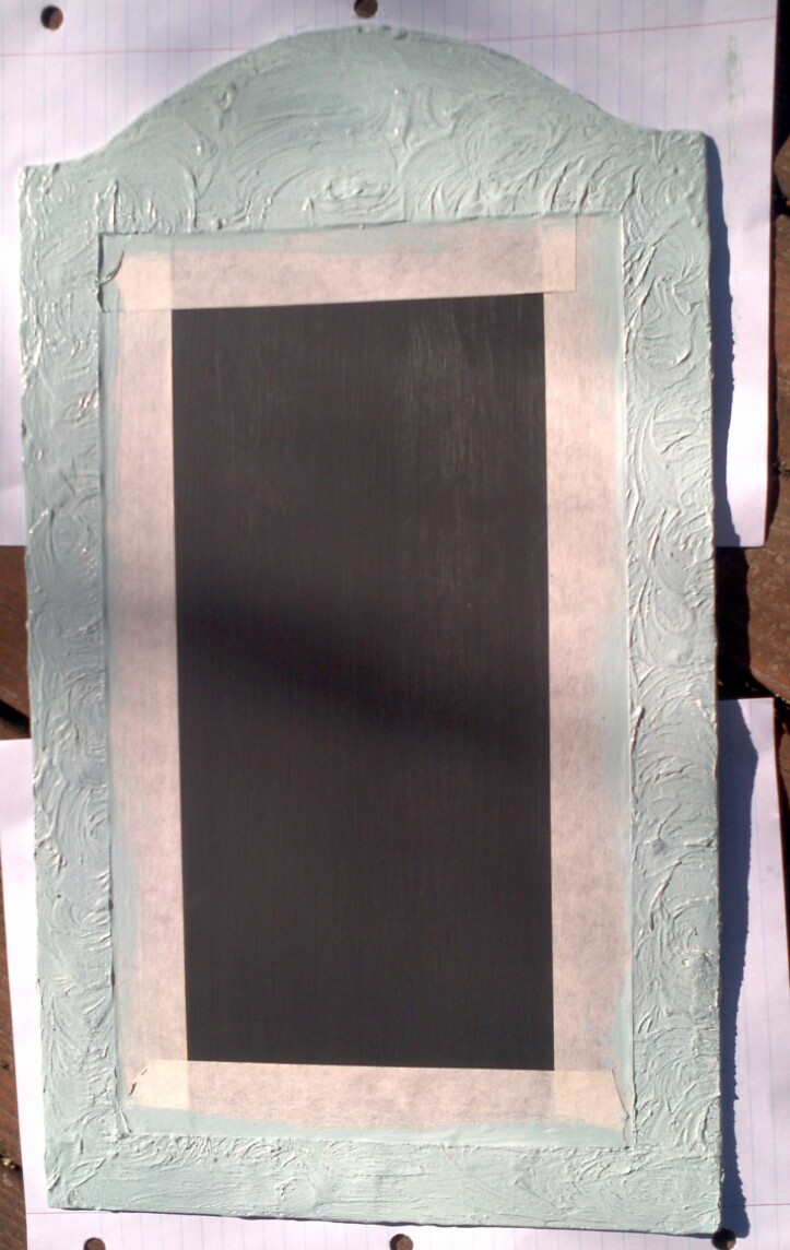 Next step, paint the center of the board with chalkboard paint. Don’t tell anyone, but when I do small projects like this, I use a hair dryer to speed up the drying process. I once called a paint manufacturer to ask if it was ok to do that and the guy told me some mumbo-jumbo about the paint chemical reaction blah-blah-blah and it is not recommended. Well, so far, so good. The Paint Police haven’t come and taken me away yet. I painted two coats, and with blow drying in between, it only took a total of less than 5 minutes before I was ready to paint the outside edge of the frame. I wanted you to be able to see the texture, so I dry painted the “frame” with the chalkboard paint so it could show up in these pics. Next step, re-tape the edge, in the same places as before, right on top of the just painted chalkboard surface (this is why painter’s tape is preferred… the adhesive isn’t going to pull up the mostly dry chalkboard paint. Hey, I’m impatient!). This taping process is pretty easy since the joint compound formed a bit of a “lip”. Now, paint your chosen framed color. I just did one coat, but you can decide whether yours needs another or not.