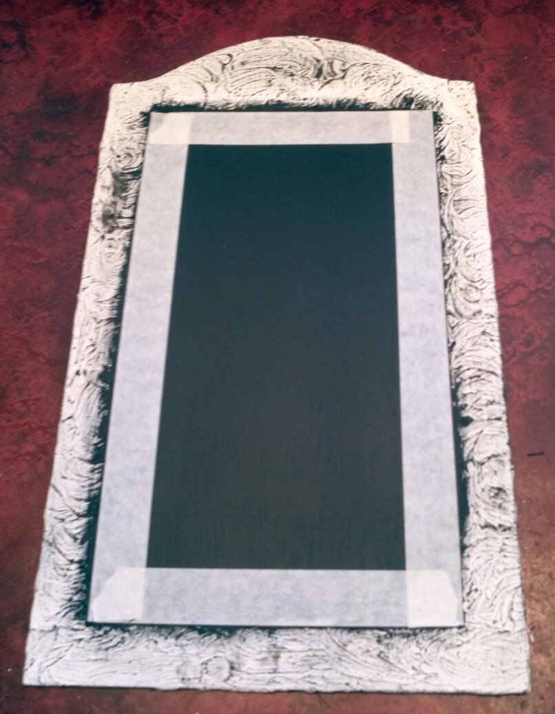 Now, for the fun part. Spread a thin layer of joint compound outside of the tape line to form a textured frame. I had planned that I would use the foam stamp to create texture, but decided that I am probably the only human on the planet with that exact stamp and nobody would be able to duplicate it, so I just used my fingers to form a random swirly texture. Kind of similar to frosting a cake…except with your fingers. Don’t worry, this stuff washes off of your hands and surfaces really easily. Before the joint compound dries, remove the tape. It should take less than 30 minutes to dry. The edges will be all messy, but this is an easy fix. Break off the larger chunks of dried joint compound and then wet your fingers to “sand” the edges smooth. Super easy. If you feel like the surface is too harsh looking, you can also go over that with your wet fingers. Easy.