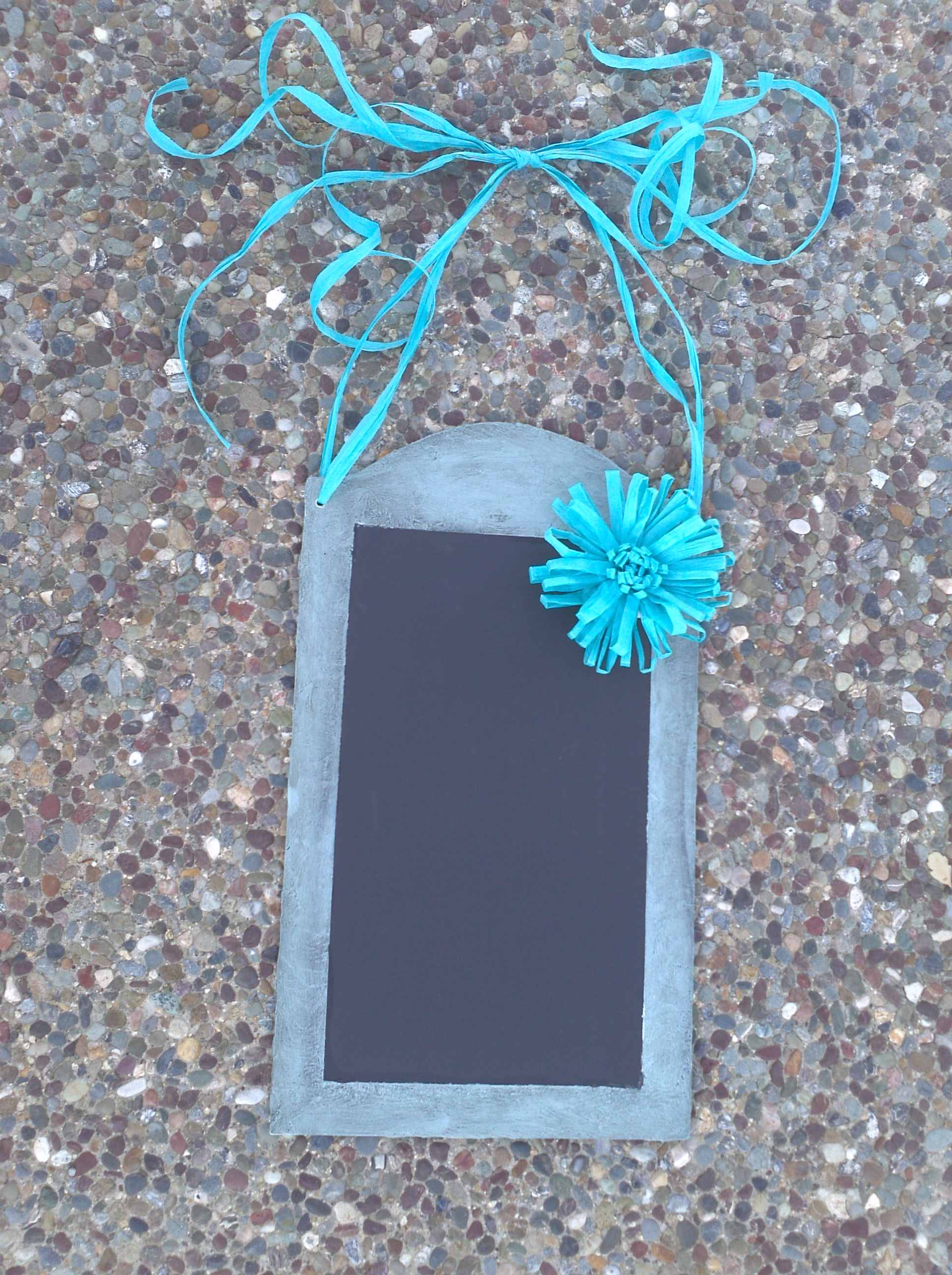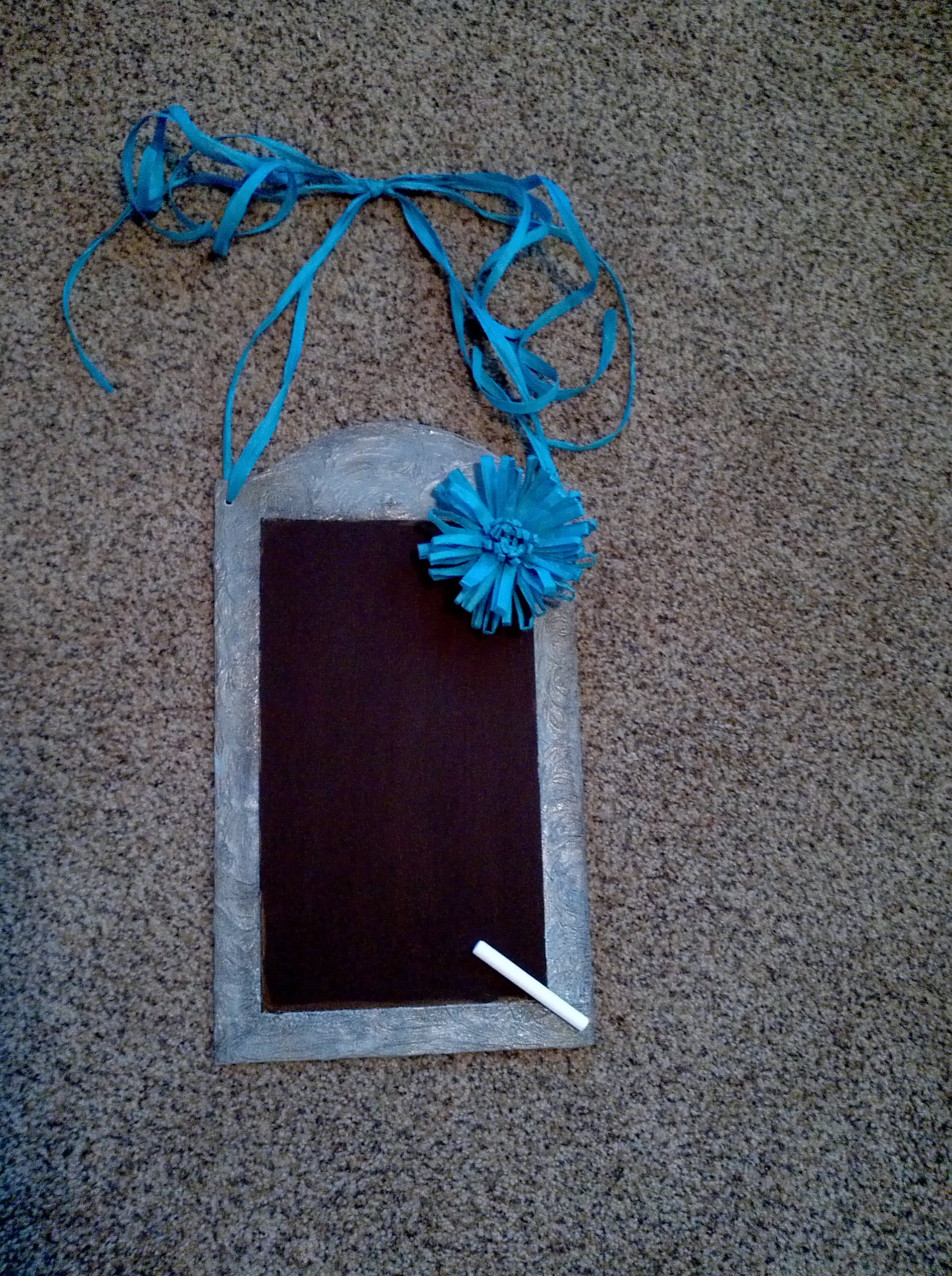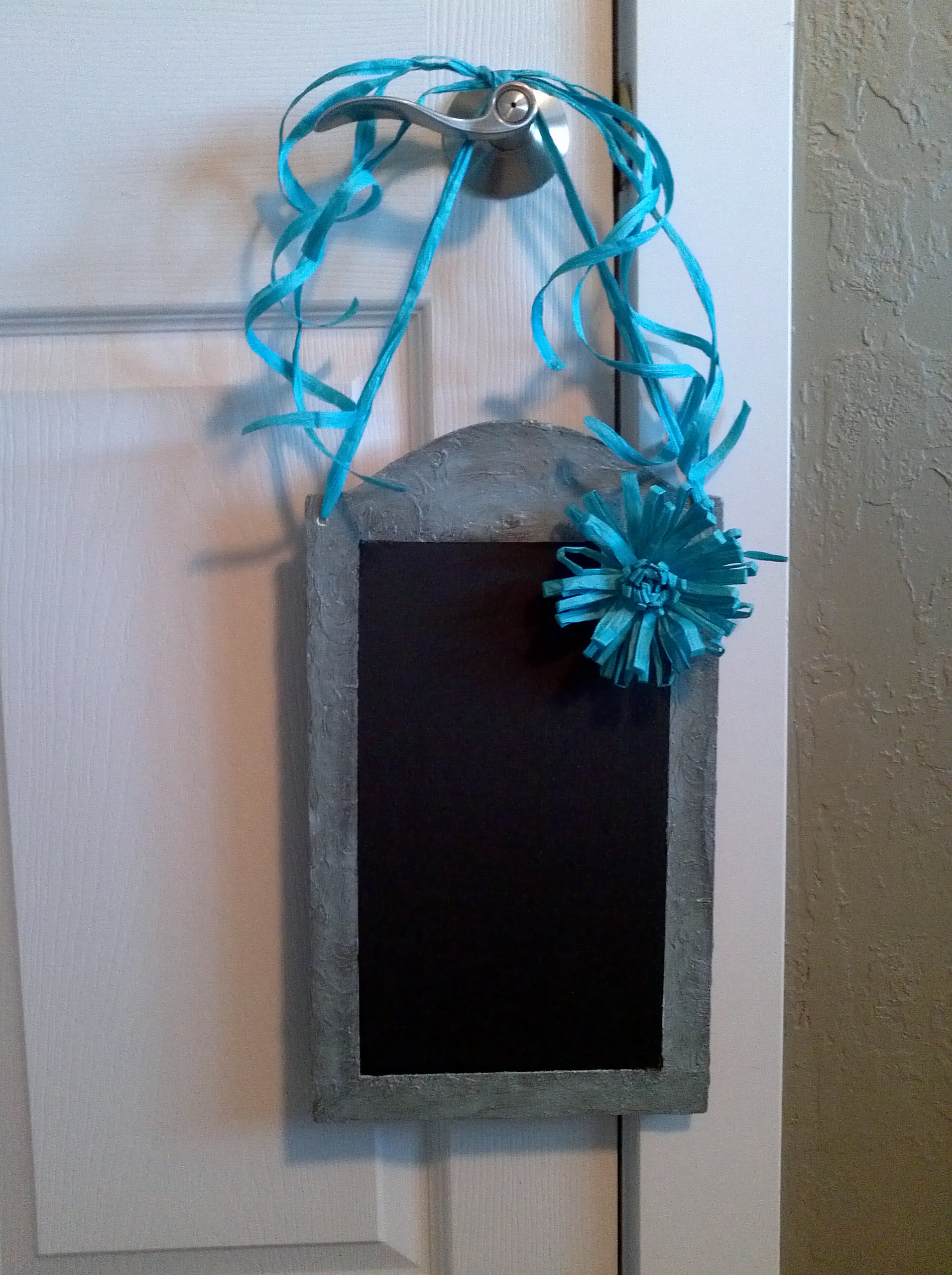 For the look that I wanted, I added a bit of Minwax Ebony stain. I like how it changes the color and makes the textures pop out a bit more. You can use a wadded up paper towel to sop up extra stain if it gets darker than you want it to be, then remove the tape. After leaving it in the sun (I’m impatient, remember?) for an hour or so I was ready to finish it. Since the joint compound covered up the original holes. I had to uncover them by poking through from the front of the frame towards the back. Ribbon came next. I could blah- blahabout how I did it, but I know that you can figure it out. Suffice it to say that mine is a double layer ribbon hanger with extra bits of ribbon tied in a knot at the top to make it more frilly. Lastly, I hot glued the ribbon bow to the chalkboard to up the WOW! factor.
