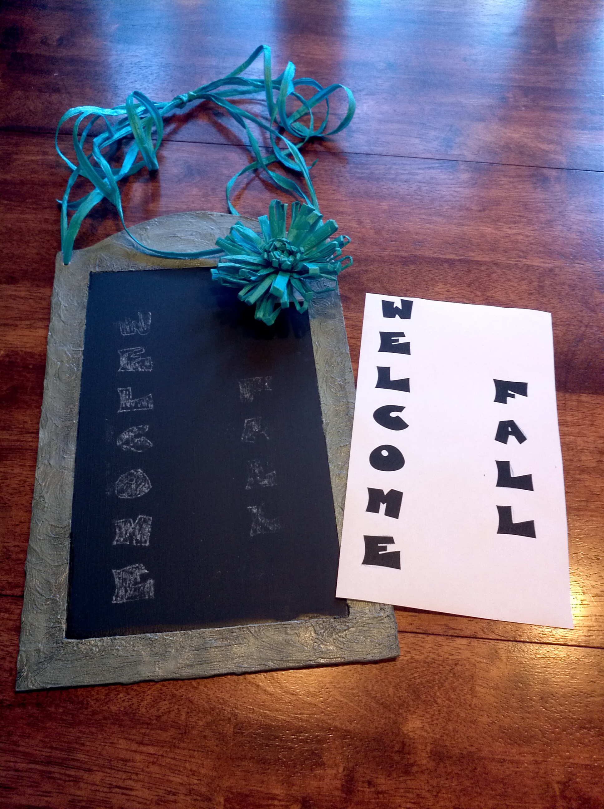 Do you want to know how I did it? First let me tell you the supplies that you need: Black chalkboard paint, joint compound (there is likely some in your garage right now…if not, go ask a neighbor- you don’t need that much), masking tape (painter’s tape is preferred), your choice of paint color for the “frame”, Minwax stain (optional)- I used Ebony, chalk, paintbrush, scissors and, of course, the plaque and decorative bow & ribbon. Oh, just a suggestion; some of the Dollar Tree plaques were kind of bent, find a straight one if you can. Got it all? Let’s go!
