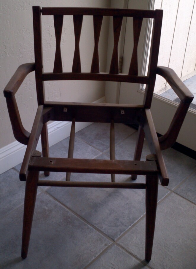 Here is a chair that I bought at a yard sale for $3 (!) a couple of months ago.  It has been sitting in my garage, waiting for me to do something amazing with it.  Usually I am the first person to slap paint on any wood around, but for some reason, with this chair I might even consider keeping the (walnut?) wood.  No promises, though.  Anyway…