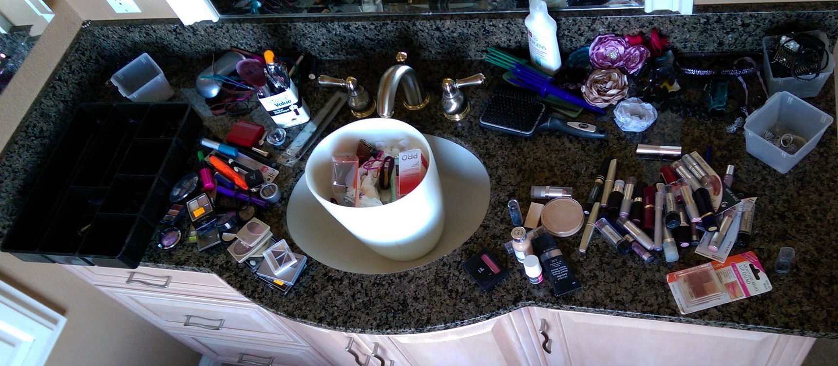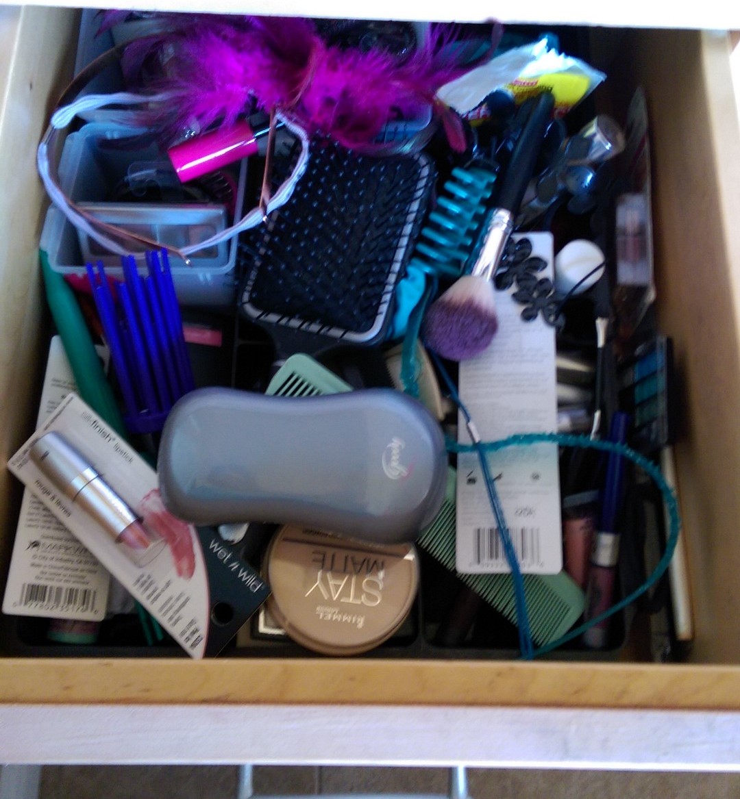Gross, huh?  A mish-mash of lipsticks, eye shadows, combs, make up brushes, hair ties, etc., etc. . There was a drawer organizer down there somewhere, but the junk on top hid it.