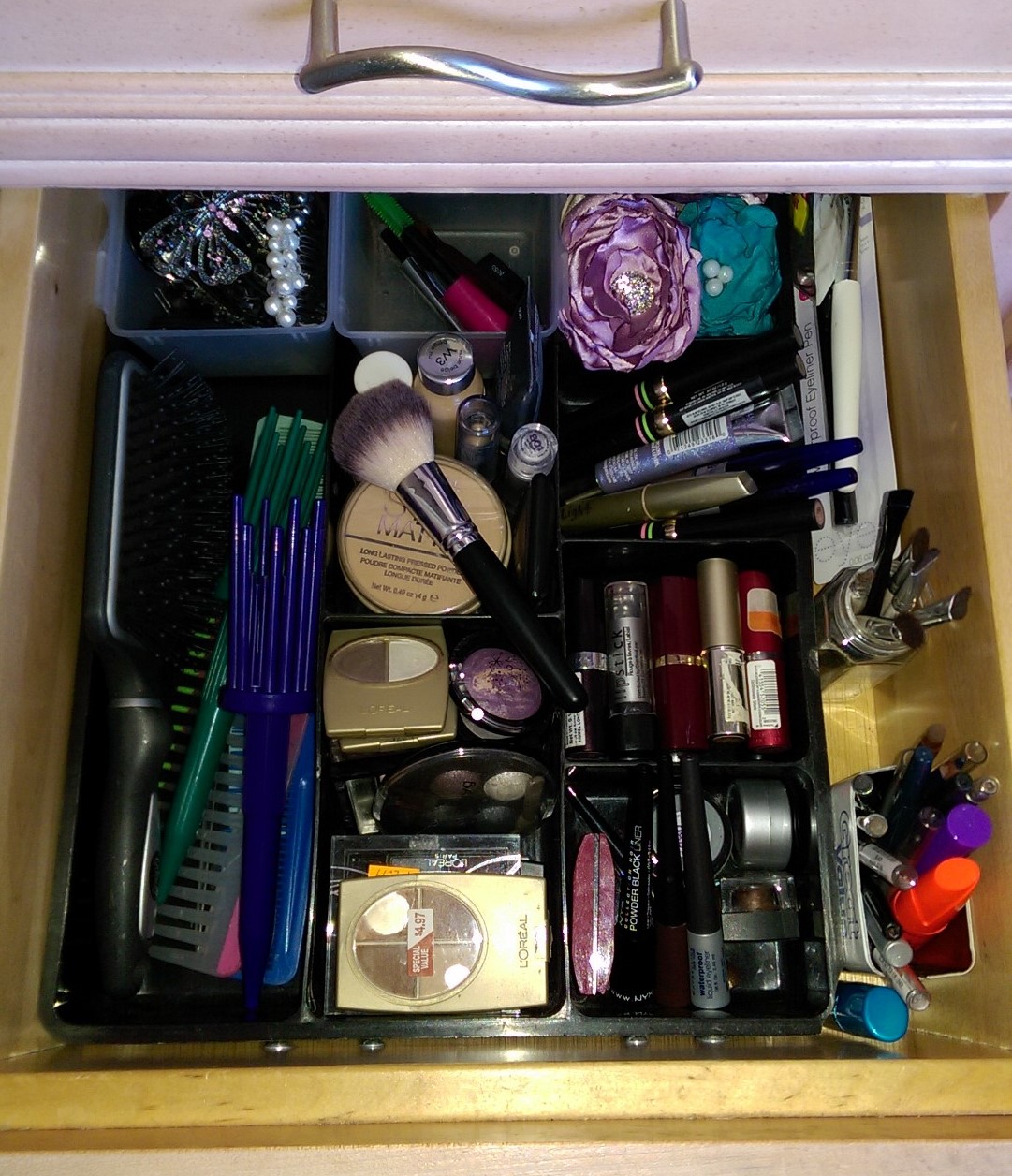 Do you every get distracted?   Mean to do one thing and then start another totally different thing?  I did that today… and now I have a fully organized hair and make up drawer as a result.  Distraction: not always a bad thing!