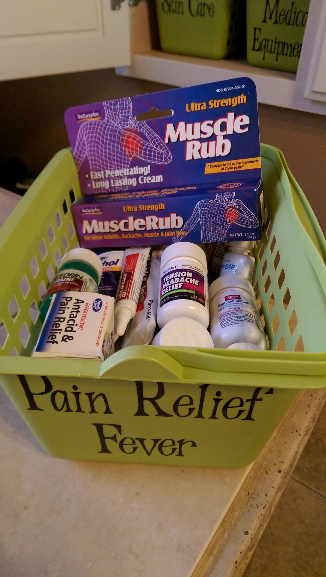 Years ago I kept all of our medications in a couple of plastic boxes above the freezer.  I had 5 little children at the time and wanted to keep meds out of reach.  Whenever I needed a med of any kind, I had to search through both boxes to find what I needed.  It was more than a little frustrating.  I then organized the 2 boxes by making wooden inserts that divided the boxes into sections and that worked better, but stuff would still overflow into other sections.