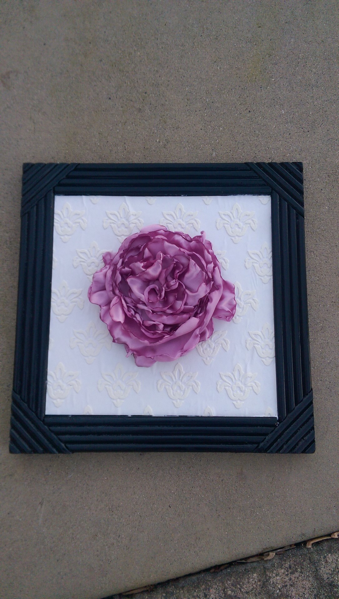 This finished flower turned out to be about 8 1/2 inches wide.  Big enough to make a statement in a frame that I backed with unpainted textured wallpaper: