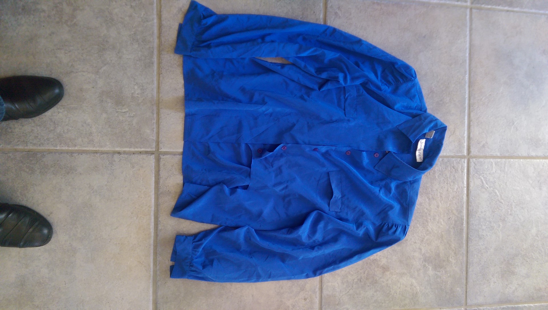 I looked in my fabric stash and found this lovely blouse that had been purchased and cut up for my daughter’s school project last year.  This little number set me back probably $.50.  Way cheaper than fabric store fabric.  I didn’t want to ruin good fabric if my big idea didn’t work.