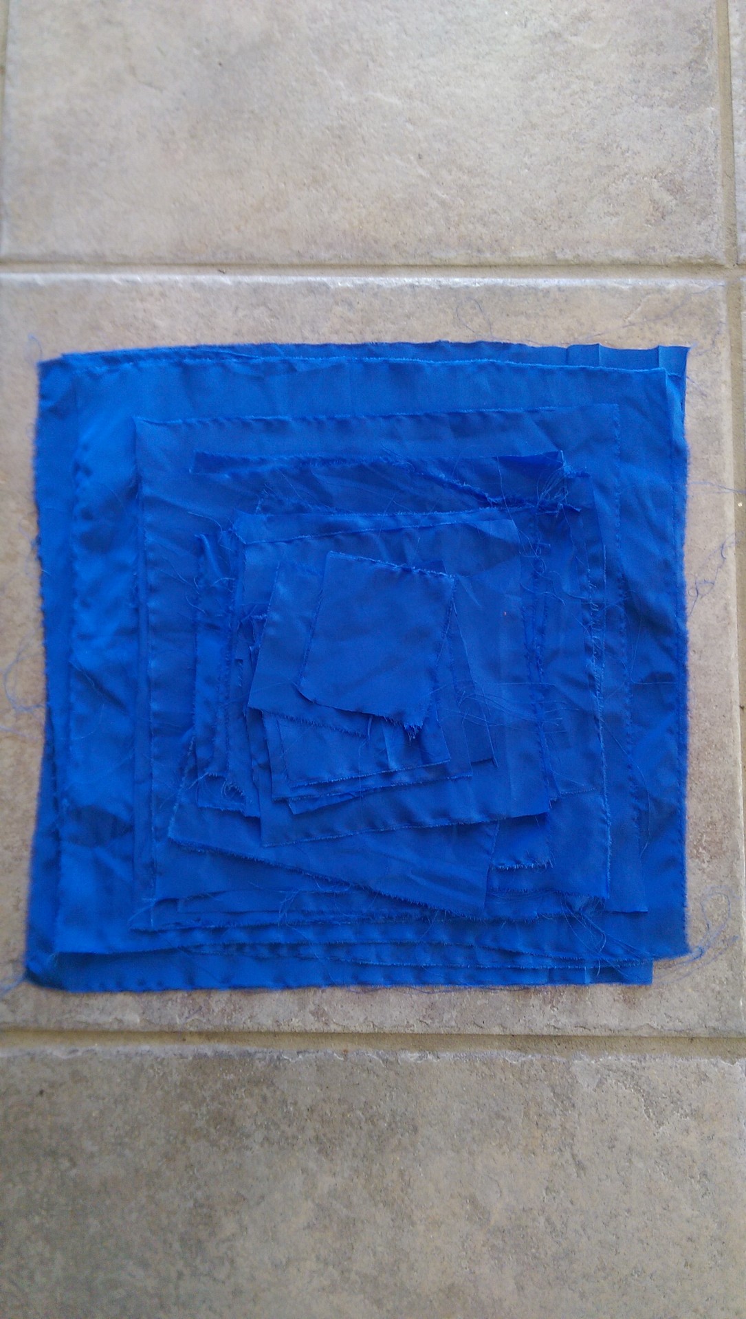 As I started cutting I realized something awesome, this 100% polyester fabric tears really easily.  In no time at all I had a large stack of fabric squares.  The largest squares were cut out of the back of the blouse, but I was amazed at how much fabric was in each sleeve.  I didn’t even try to count how many layers this flower has.   I just know it was a lot because I wanted my gigantic flower to be nice and fluffy.