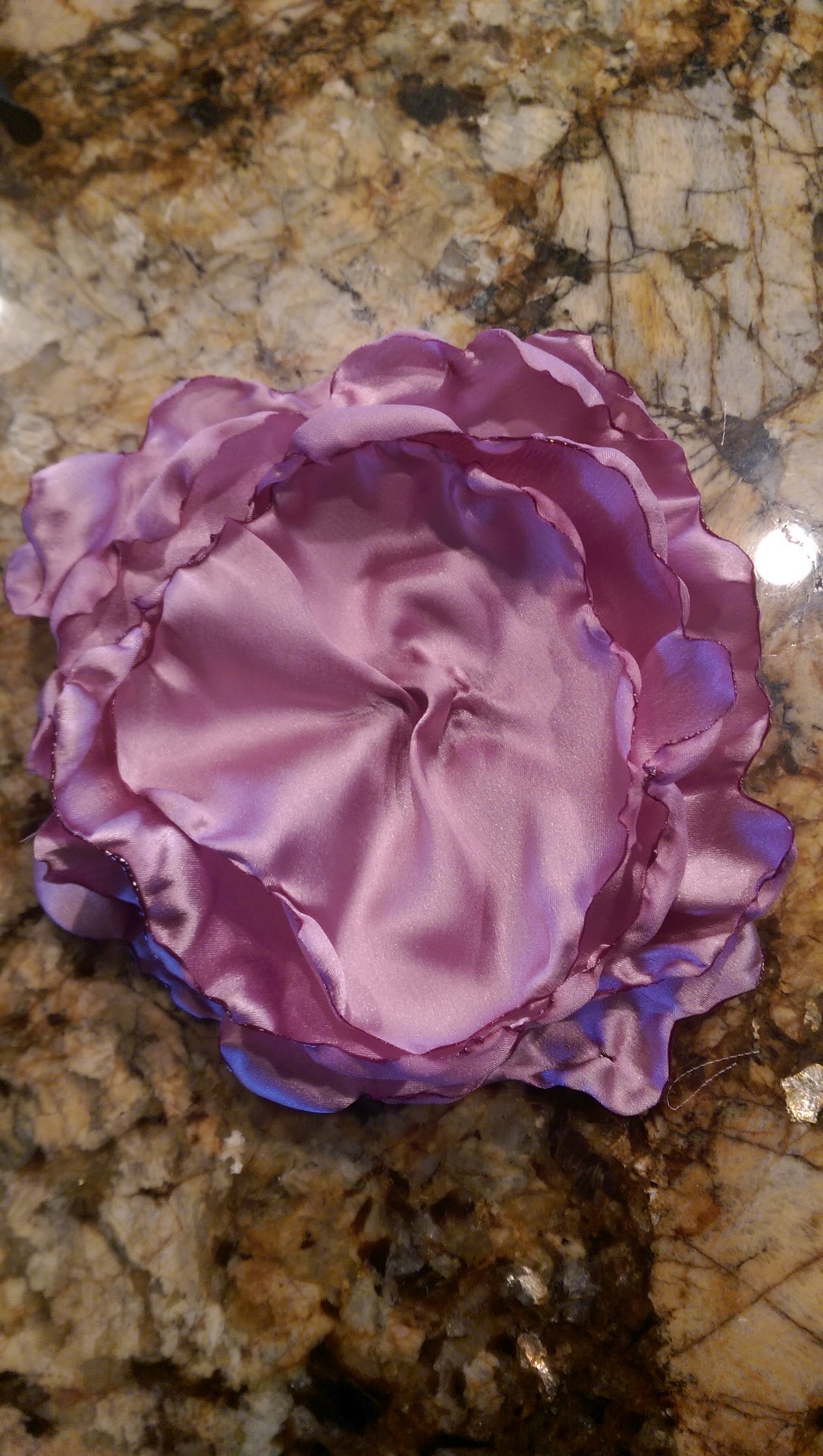 Remember this post where I showed you how to make adorable satin flowers?   Well, I love those little flowers so much because they can add cute touches to anything from hair, to clothing, to home accessories, to purses, to gift packages.  To be honest, though, they are a bit small to add a lot of WOW to a room.  You know the theory that “bigger is better”?  Well, it is if we are talking about bigger budgets, bigger backyards, bigger pieces of chocolate cake.  Bigger thighs?  Maybe not so much.  An-y-way.  I thought that I could take this idea of making satin flower up a notch and make one, well, bigger.  The process was pretty much the same except I added more layers.  Eleven, to be exact:
