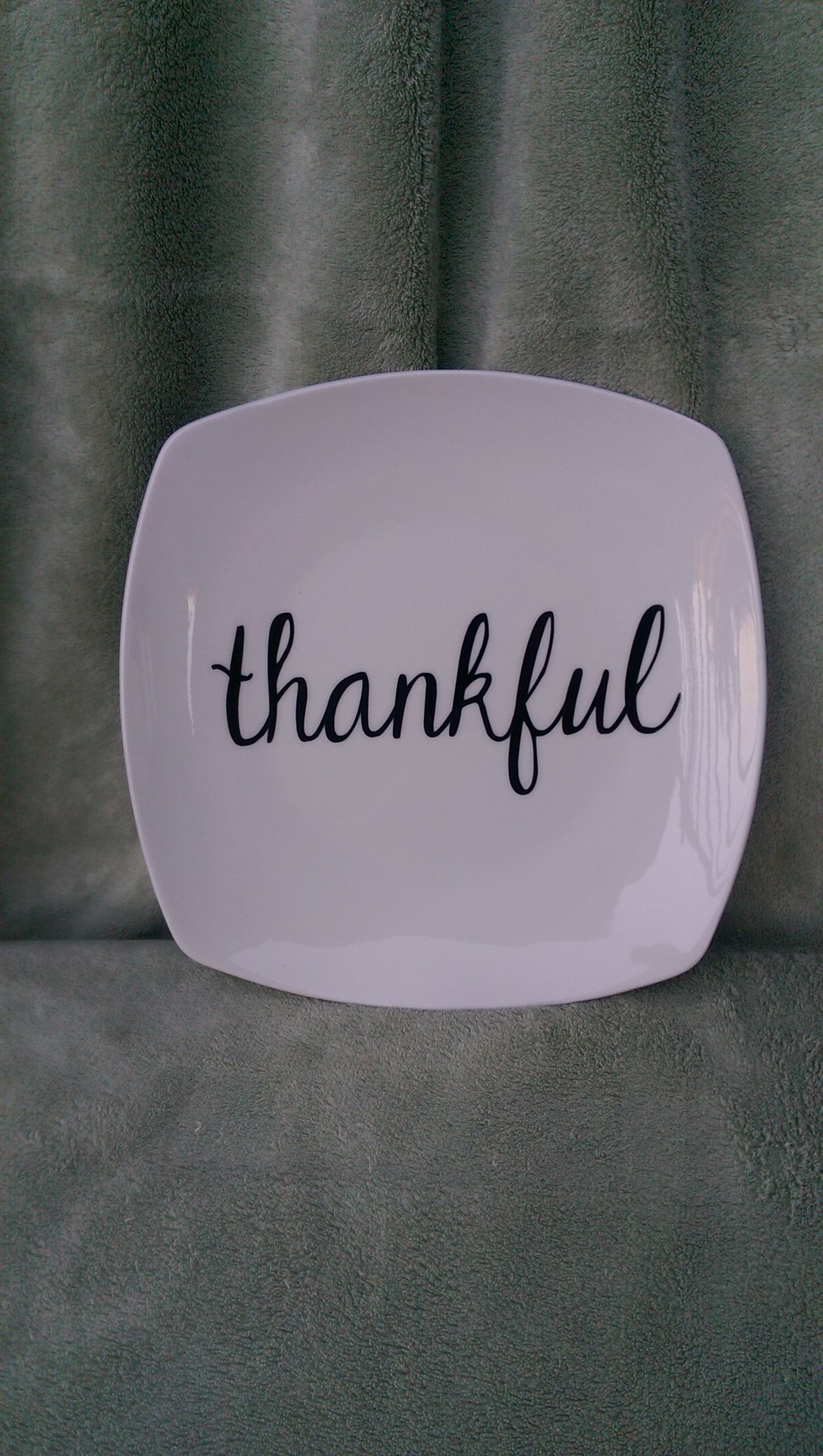 This 2 minute craft  is great for display as well as for holding a plate of holiday goodies.  It is as simple as removing the backing from the vinyl sticker that I cut with my Roland Dr. Stika machine, placing the sticker and rubbing it to smooth it out, then removing the masking layer.  Easy peasy!  I love how simplistic it looks.