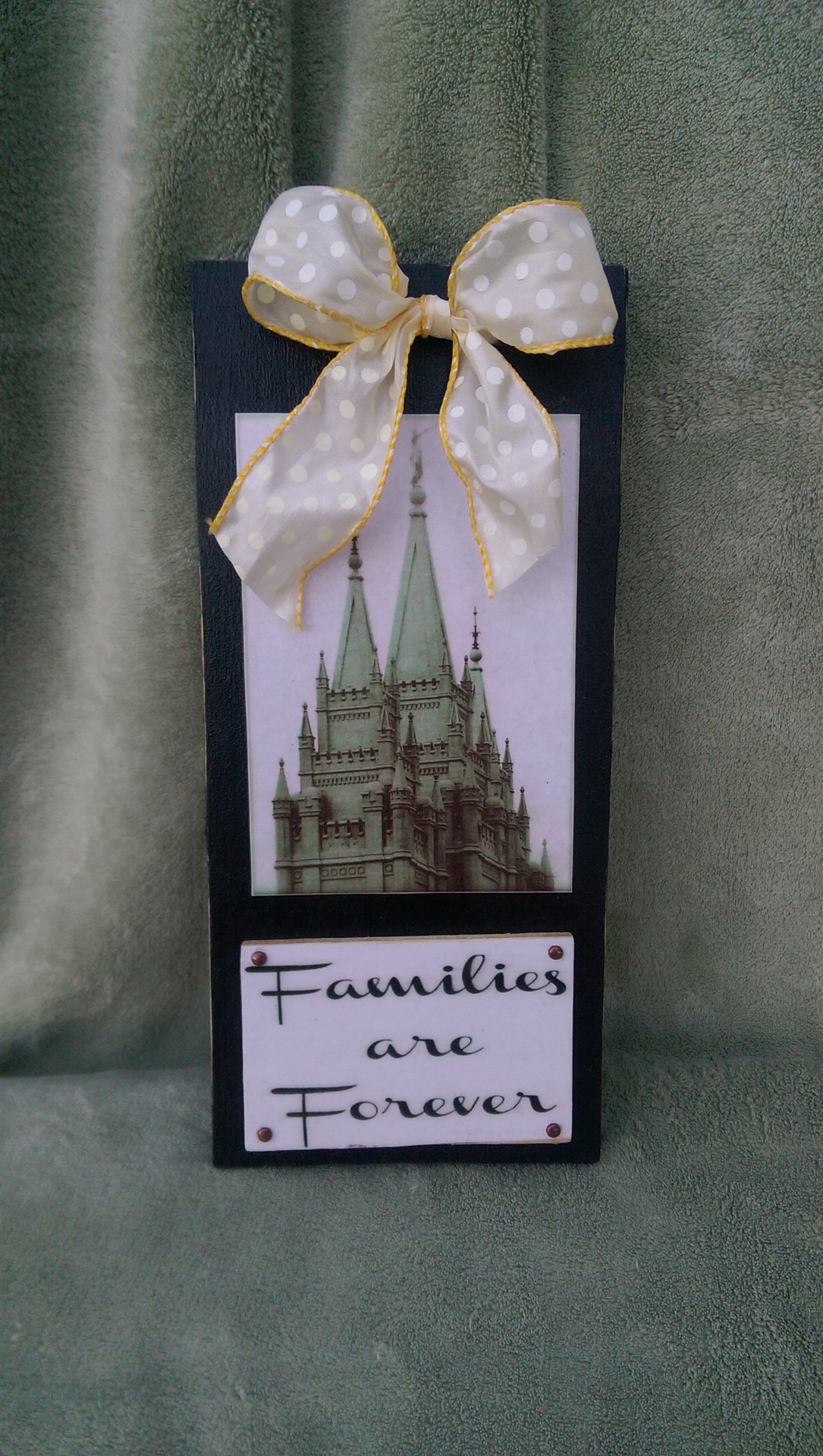 Lastly, here is a craft that I patterned off of one that my friend found online and loved.  I made sure to use an image that is copyright free of the LDS Salt Lake Temple spires.  We will decoupage that as well as the saying, “Families are Forever”.  This idea can be used in a thousand different ways, using different pics (pics of children and grandchildren, family home…) and sayings.  I drilled tiny holes in each corner of the word wood so I could easily insert little brads for added detail.  I also drilled a couple of larger holes on the top for the ribbon to go in and, BAM! it’s a fabulous item to hang in your own home or to give as a gift.
