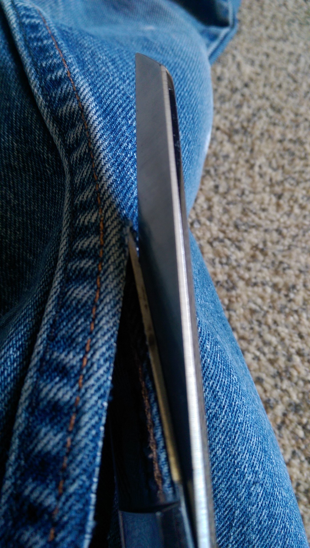 As you can see, I used a tiny loop of tape to hold each side of the fabric/cardboard in place, making sure to line the cardboard up well. Easy. Next, I took it to my sewing machine and used a long, straight stitch around the whole thing. I made sure to start at the center-top of the tag and overlapped a few stitches to secure the thread, knowing that the ribbon would hide the cut threads. Once the sewing was complete, I trimmed the fabric to the actual shape of the tag. For added effect, I frayed the flannel edges of one of my tags, and the other tag I snipped lots of tiny cuts along the whole fabric edge to create my own fringe.