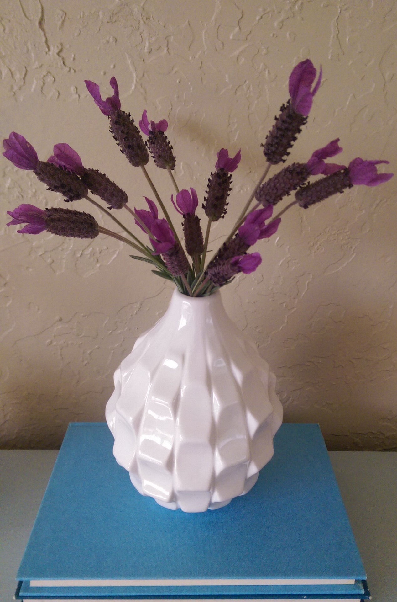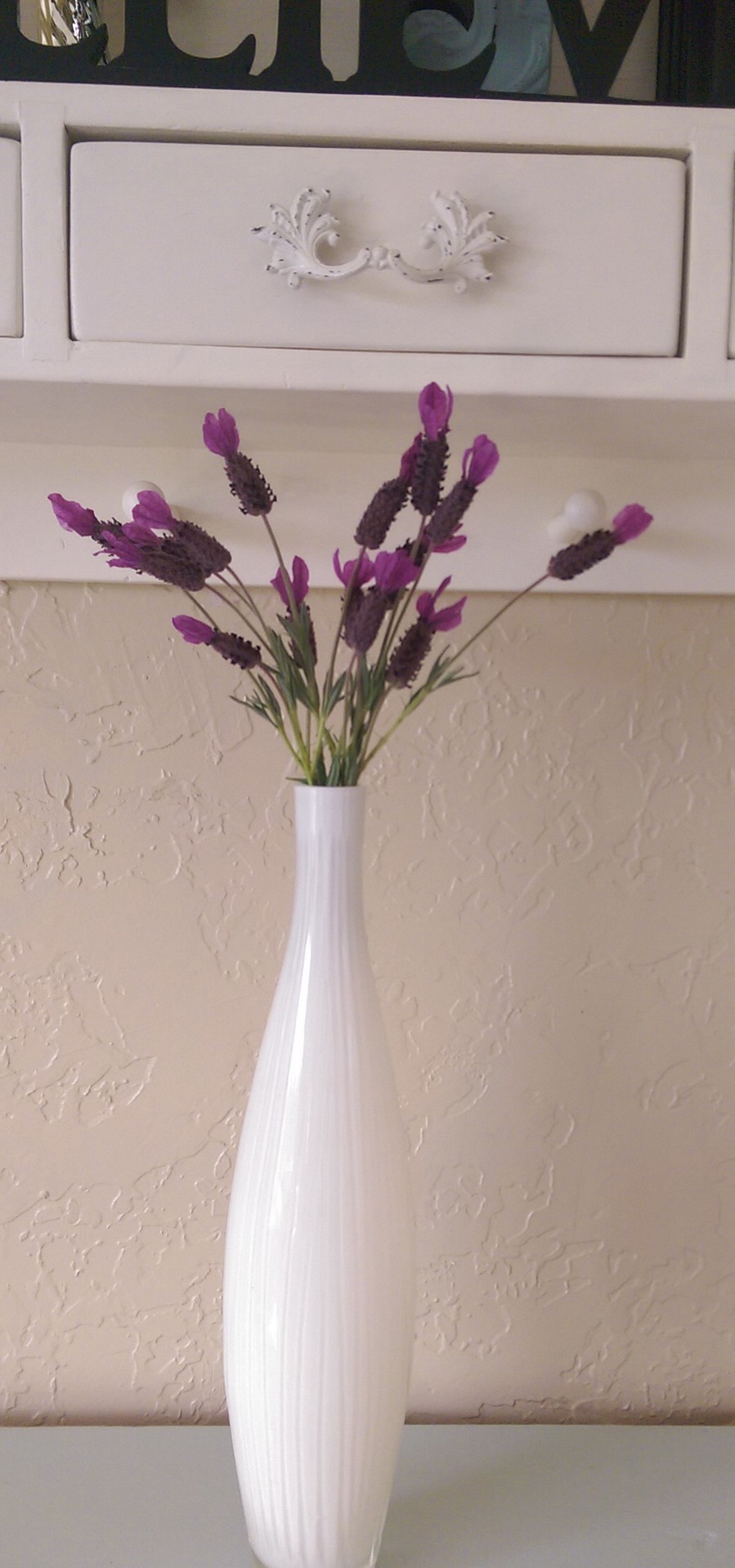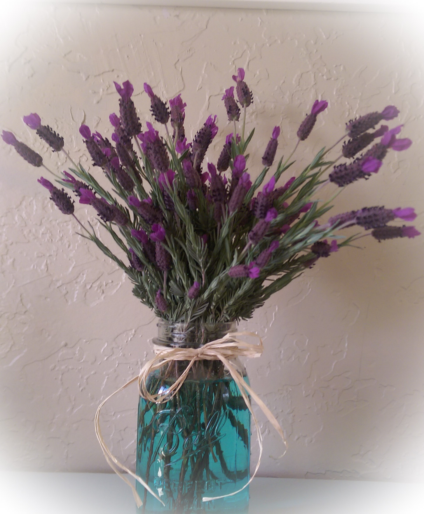 Today I decided to get all Martha Stewart-like and bring some of my outdoors…indoors.  Some people like to gather a bit of every kind of flower that they have in bloom and put them in a vase.  Me?  I prefer only one type of flower in each arrangement.  That’s just me, though.  I decided to gather lavender since we have absolute TONS of it in our landscaping.